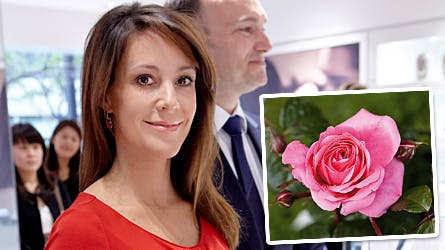 Rosen findes også i andre farvetoner, herunder en lys orange. Selve planten, der typisk bliver 80-150 cm høj, er god til afskæring og blomstrer fra juni til et godt stykke ind i efteråret. Den trives i almindelig havejord, men tåler ikke vind. På billedet ses prinsessen i færd med at døbe sin rose under rosenfestivalen i Bogense i sommeren 2010.