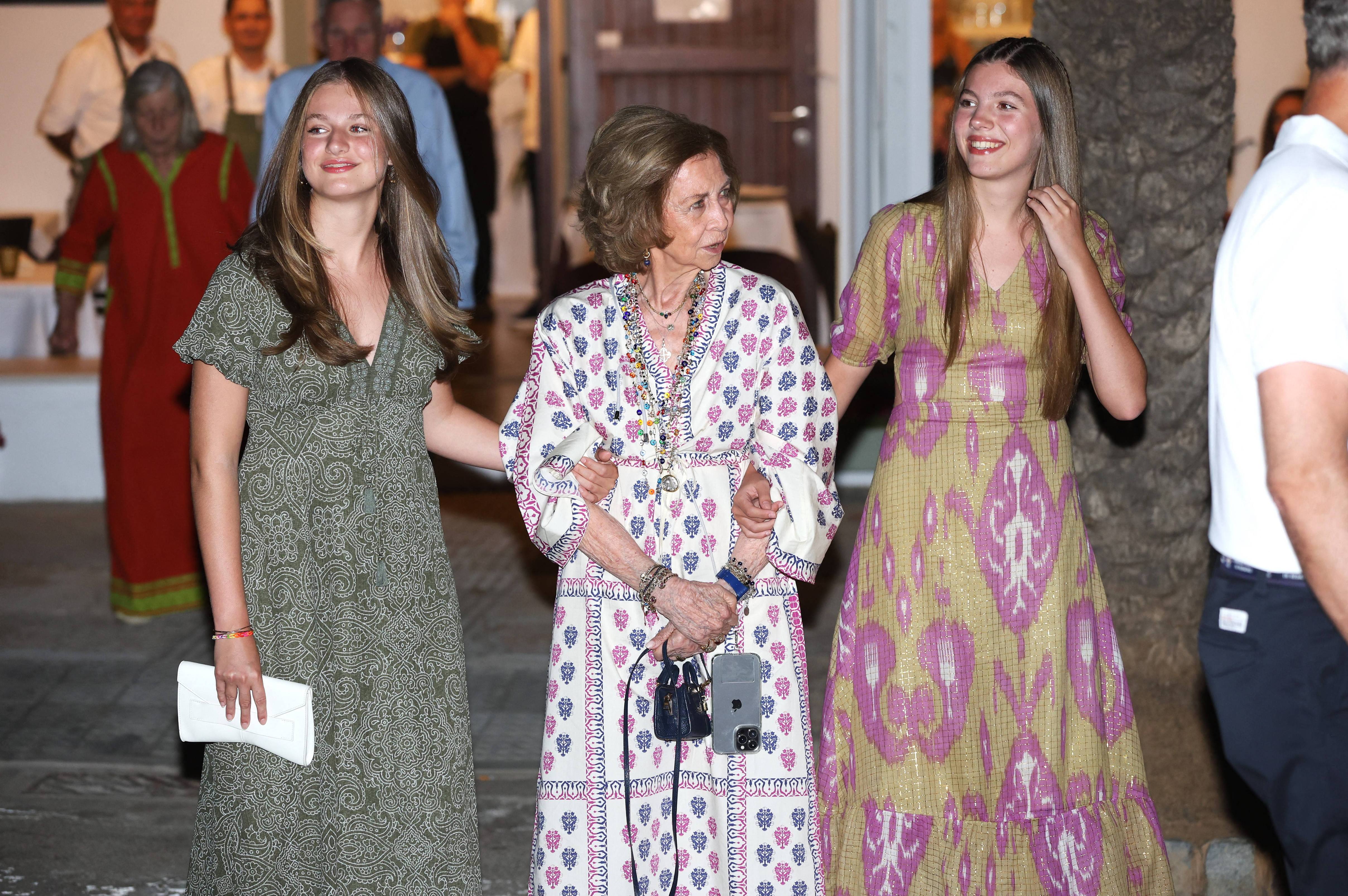 Til middag på familiens ferieø: Prinsesse Leonor og prinsesse Sofia arm i arm med farmor