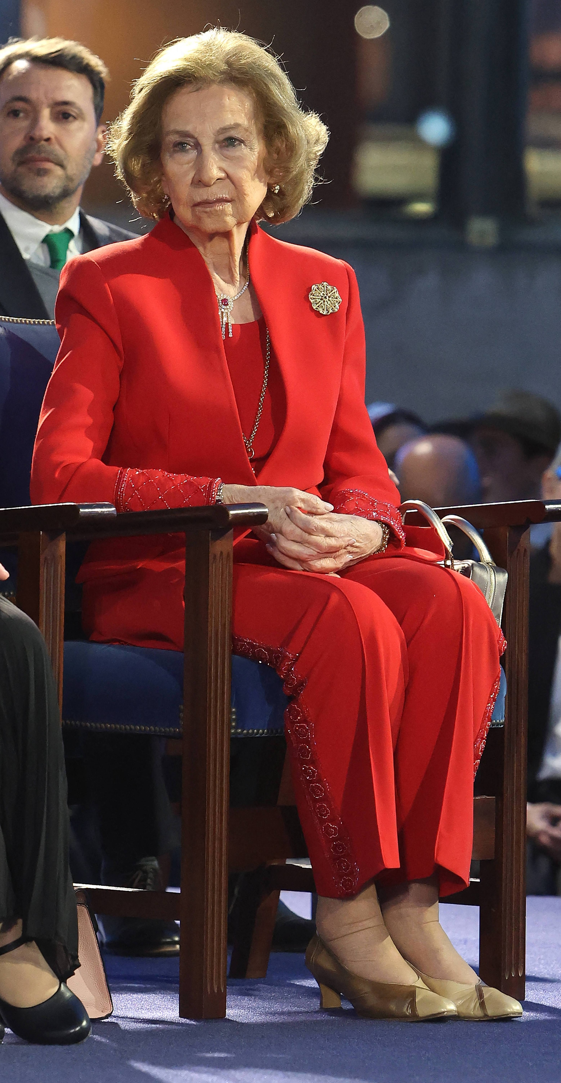 Til arrangementet bar dronning Sofia et knaldrødt jakkesæt med det fineste glimmermønster på ærmerne og ned langs bukserne.