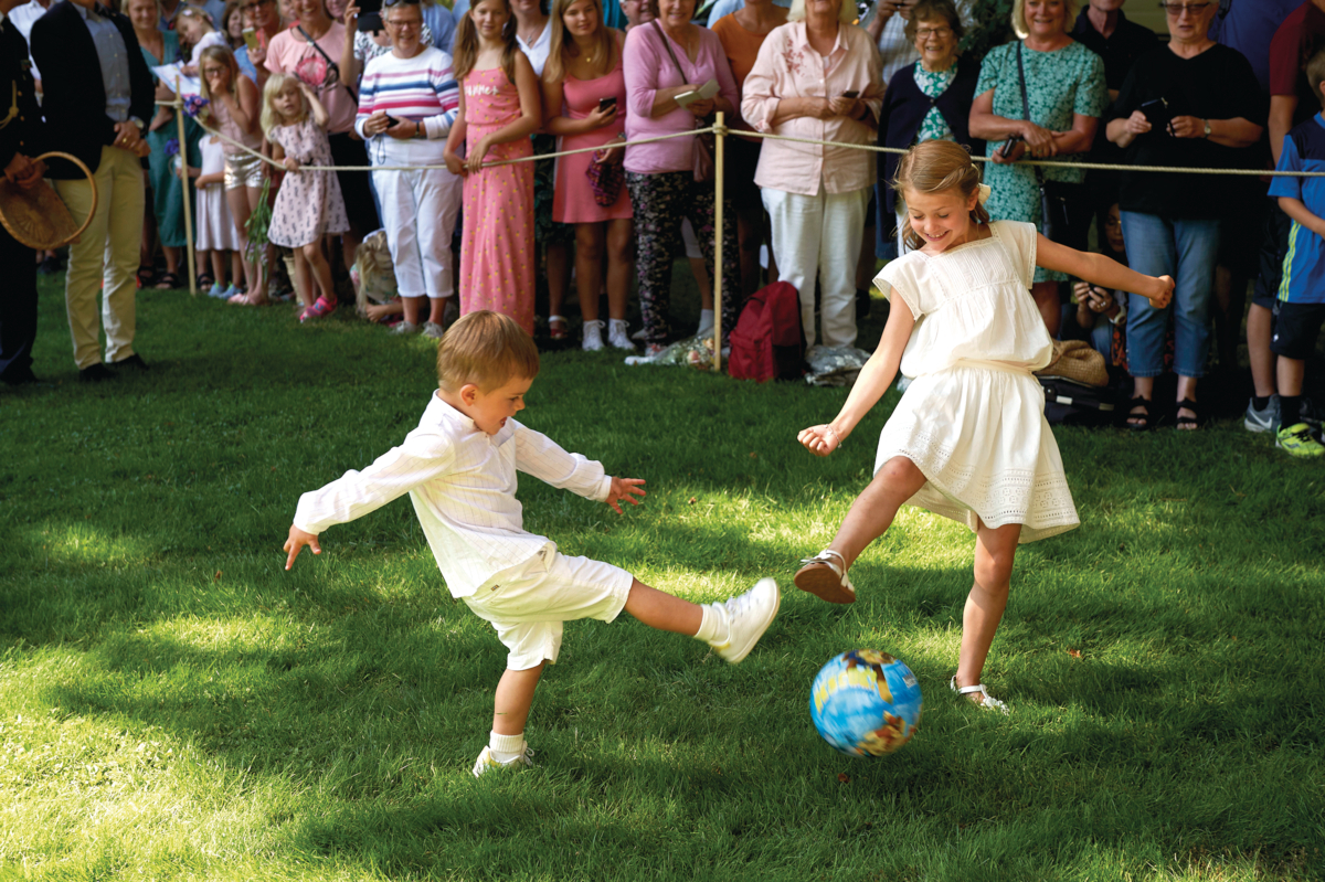 Herunder ses han og prinsesse Estelle spille fodbold til Victoriadagen i 2019.